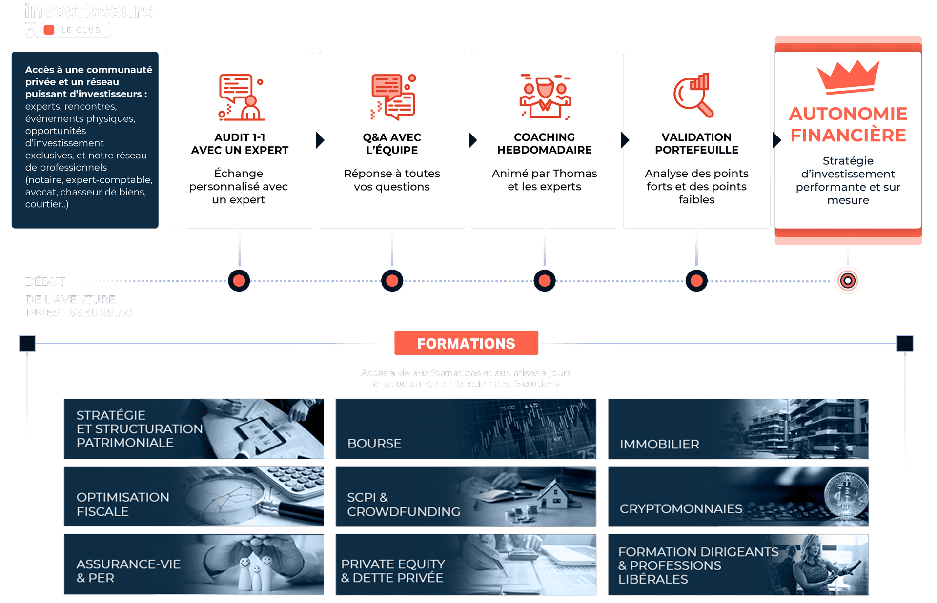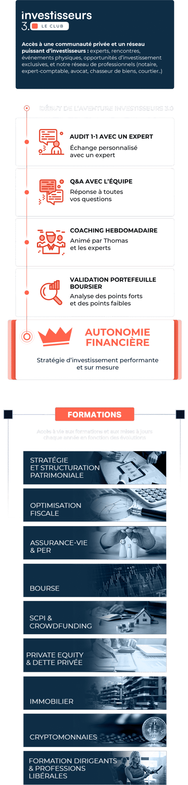 Le Club Investisseurs 3.0 va plus loin : il vous permet de passer à l’action avec une méthode structurée, des formations complètes couvrant toutes les stratégies d’investissement (bourse, immobilier, fiscalité, crypto, private equity…), et un accompagnement par des experts.